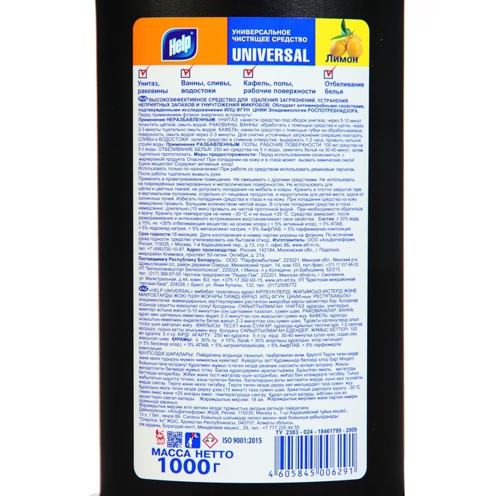 Чистящее средство Help Универсальное представлено в объеме 1 литр, что делает его экономичным в использовании. Оно имеет удобную упаковку с дозатором, который позволяет точно контролировать расход средства.