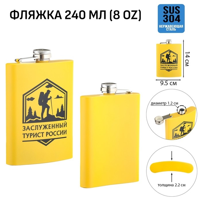 Фляжка для алкоголя "Заслуженный турист России", нержавеющая сталь, 240 мл, 8 oz