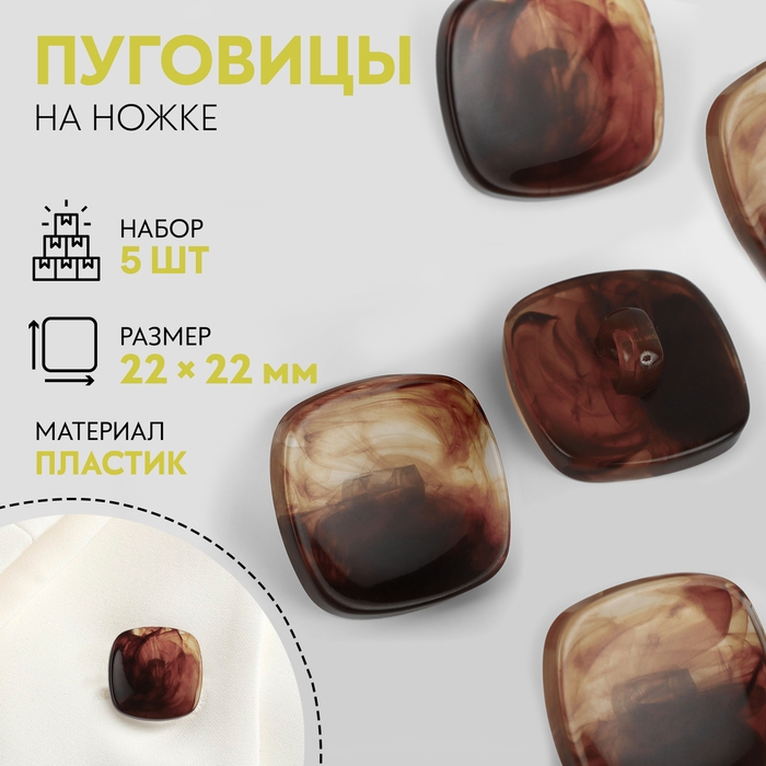 Набор пуговиц на ножке «Квадрат», 22 × 22 мм, 5 шт, цвет коричневый