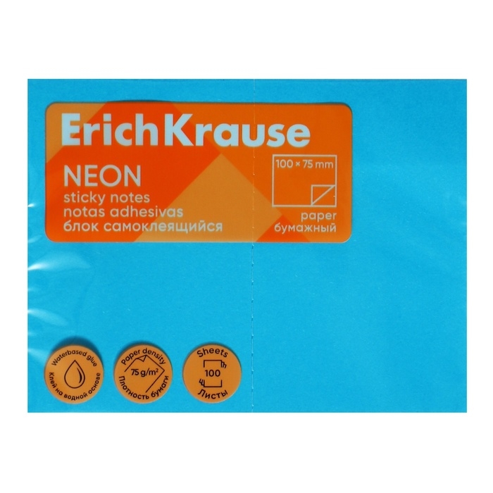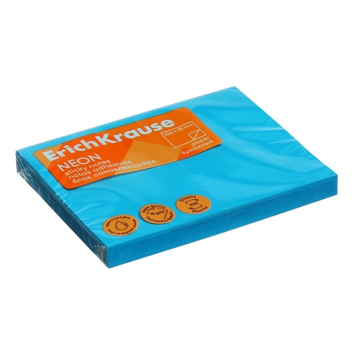 Блок с липким краем бумажный 100х75 мм, ErichKrause "Neon", 100 листов голубой