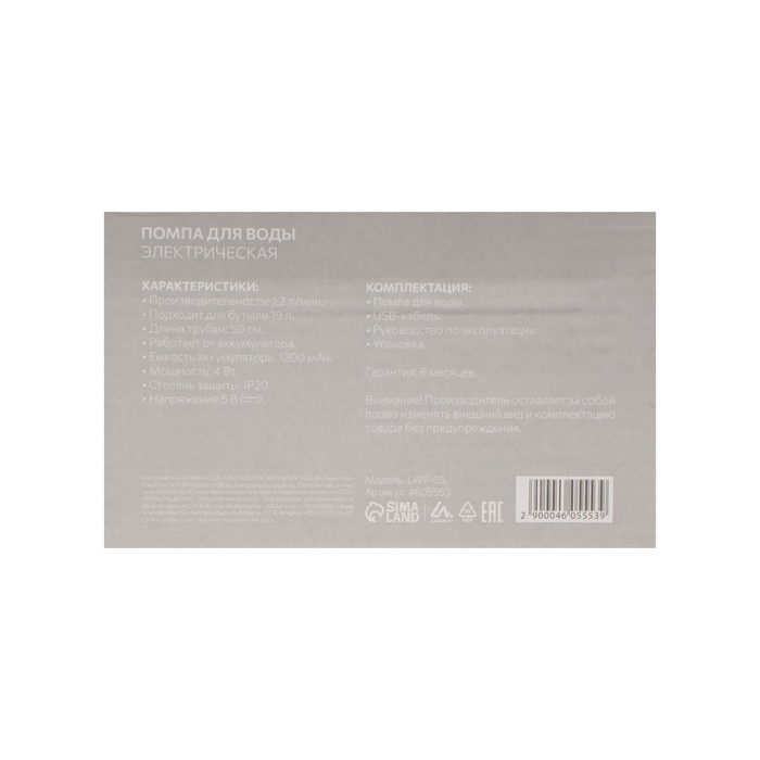 Помпа для воды Luazon LWP-07, электрическая, 5 Вт, 1.2 л/мин, 800 мАч, АКБ