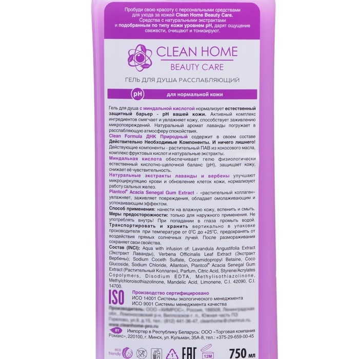 Гель для душа Clean home «Лаванда и вербена», с дозатором, расслабляющий, 750 мл