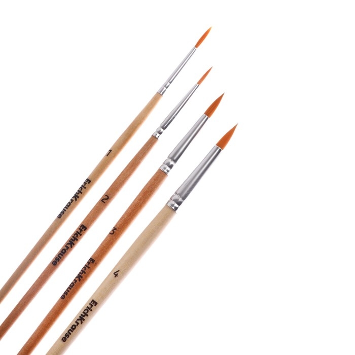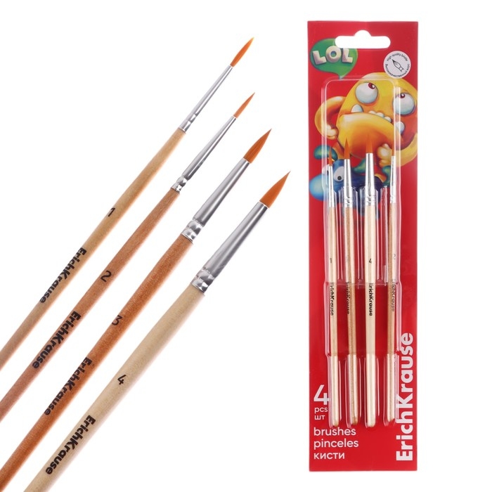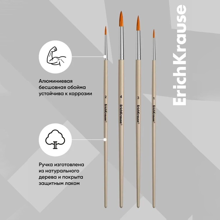 Кисти ErichKrause для рисования акварельными красками и гуашью изготовлены из синтетики. Хорошо впитывают и отдают краску, рабочая часть кисти покрыта гуммирующим составом, защищающим ее при хранении и транспортировке. Ручка изготовлена из натурального дерева и покрыта защитным лаком. Кисти разного размера позволяют рисовать как крупными, широкими мазками, так и прорабатывать мелкие детали рисунка. Цельнометаллическая бесшовная обойма из алюминия устойчива к коррозии. Круглые- 1,2,3,4.