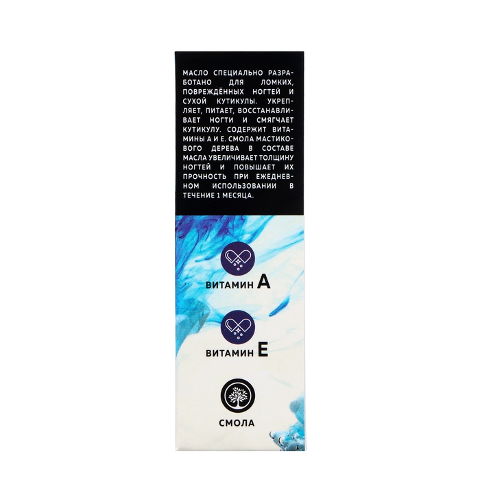 Быстро впитывается, оставляет приятное ощущение и сладкий аромат ванили, миндаля и груши. Содержит витамины А и Е. Смола мастикового дерева в составе масла увеличивает толщину ногтей и повышает их прочность при ежедневном использовании в течение 1 месяца. Рекомендовано для ломких, повреждённых ногтей и сухой кутикулы.
