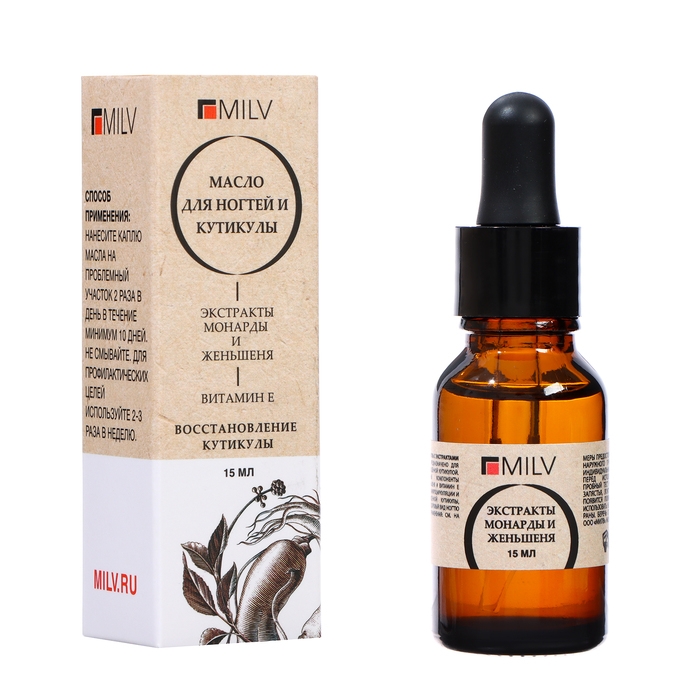 Масло для ногтей и кутикулы MILV с экстрактами монарды и женьшеня, 15 мл