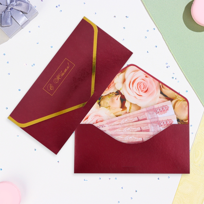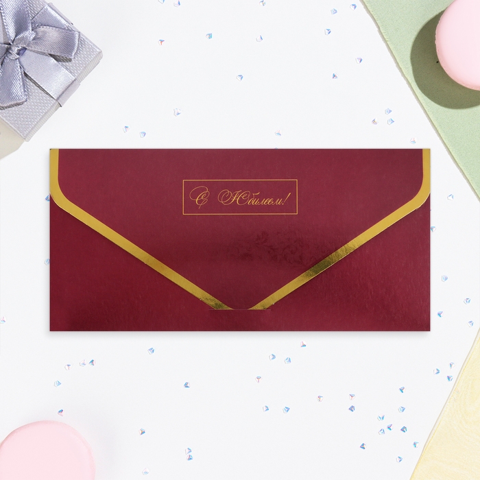 Конверт для денег "С Юбилеем!" розы в бордо, тиснение, 19,5 х 9 см