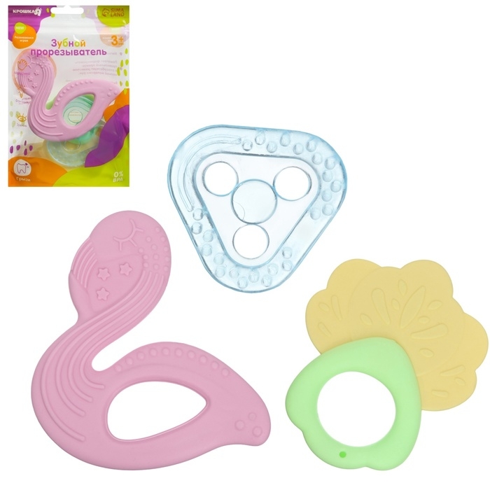 Прорезыватель снимает неприятные ощущения у малыша в период появления первых зубов. Также изделие подготовит ребёнка к процессу жевания, поспособствует формированию правильного прикуса и развитию мелкой моторики рук. Погремушка в наборе способствует развитию воображения, познанию мира звуков, цветов и визуальному восприятию.