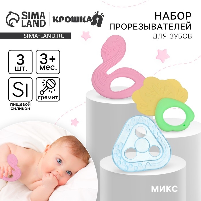 Набор прорезывателей силиконовых «Грызунки», с погремушкой, 3 шт., Крошка Я