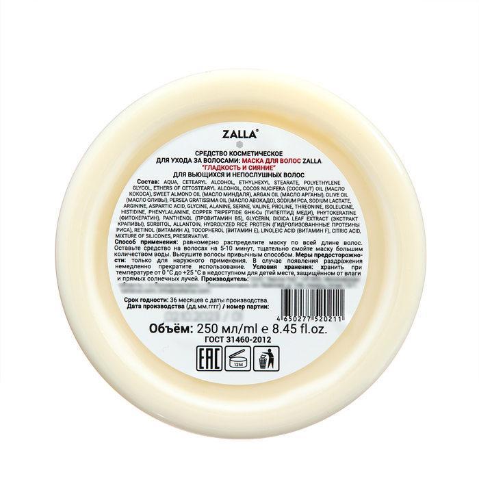 Маска для волос ZALLA "Гладкость и сияние", 250 мл