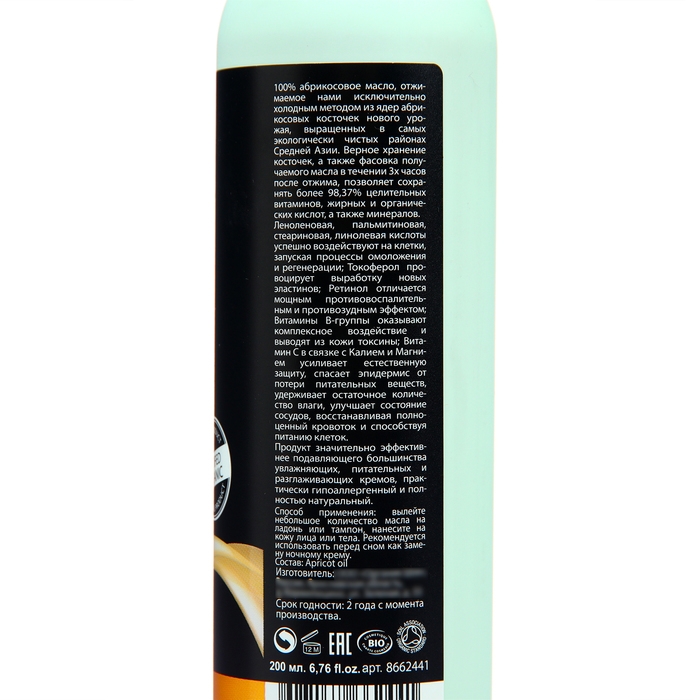 100% абрикосовое масло, отжимаемое нами исключительно холодным методом из ядер абрикосовых косточек нового урожая, выращенных в самых экологически чистых районах Средней Азии. Верное хранение косточек, а также фасовка получаемого масла в течении 3х часов после отжима, позволяет сохранять более 98,37% целительных витаминов, жирных и органических кислот, а также минералов.