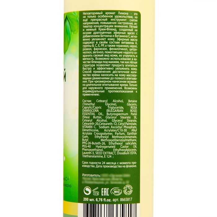 Лёгкий и нежный Крем-Флюид, созданный на основе драгоценных эфирных масел с добавлением Бетоина и Витамина С, мгновенно увлажняет кожу.