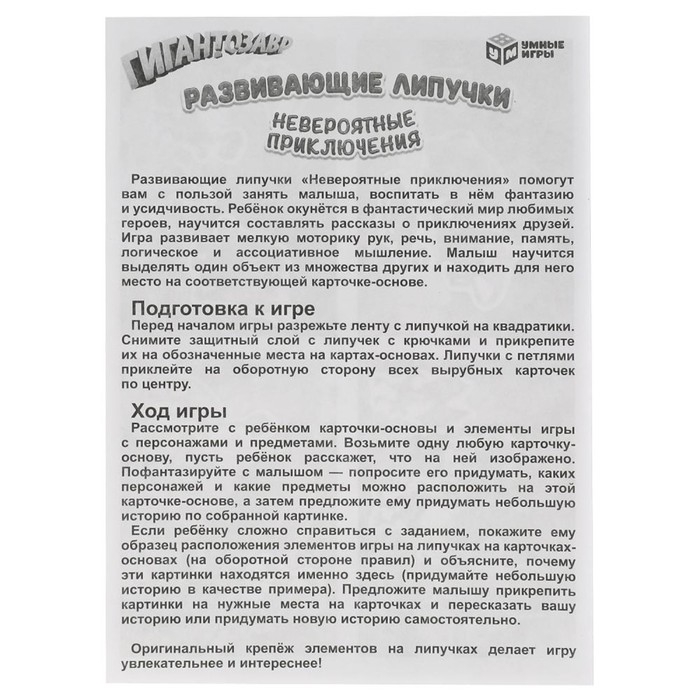 «Невероятные приключения. Гигантозавр» — развивающая игра на липучках для детей от 3 лет. С её помощью малыш научится сопоставлять логические пары. Такой досуг поможет с пользой занять маленького непоседу и воспитать фантазию и усидчивость.