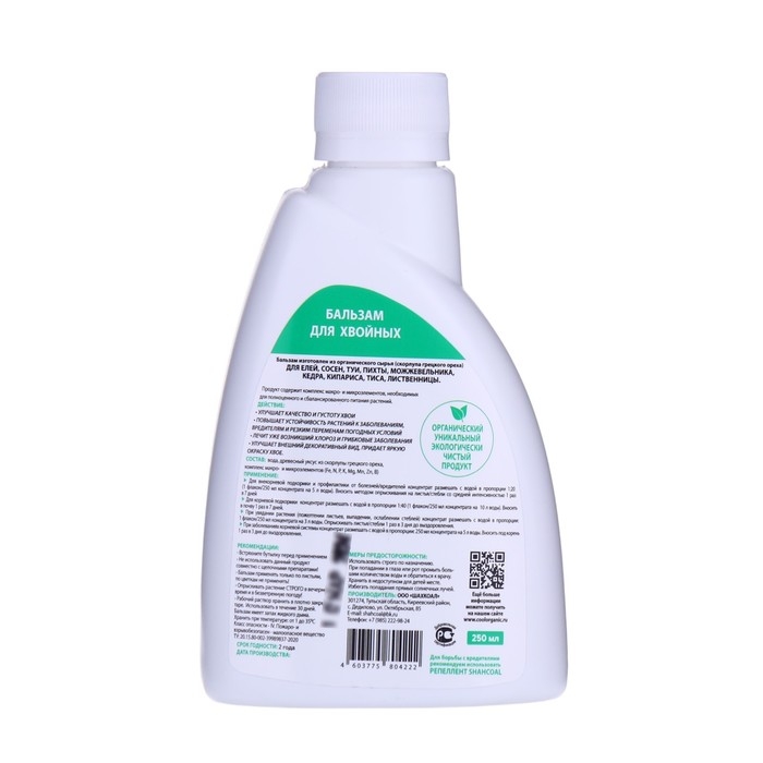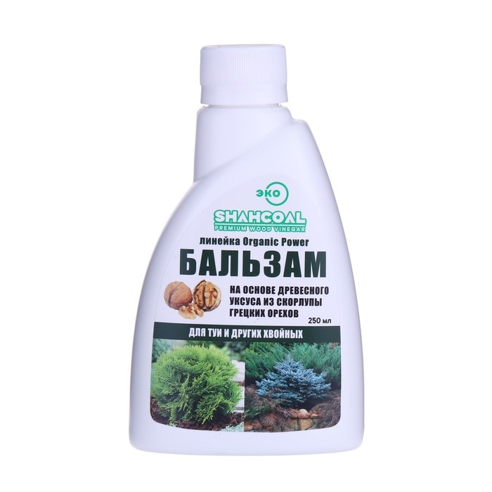 Бальзам на основе древесного уксуса из скорлупы грецкого ореха – концентрированное органическое удобрение, уникальный экологически чистый продукт, предназначенный для ухода за хвойными растениями. Бальзам для туи и других хвойных растений насыщает их необходимыми микроэлементами, благодаря которым листва приобретает насыщенный здоровый цвет, а также активно предотвращает появление болезней туевой тли, паутинного клеща, короеда, фитофторы и прочих. Бальзам питает растения для их качественного развития, усиливает иммунитет, препятствует развитию болезней фузариоза, вертициллеза, мучнистой росы, паутинного клеща, тли и других. Состав: вода, ореховая кислота, комплекс микроэлементов (более 50).Серия бальзамов из скорлупы грецких орехов :Отпугивает насекомых с листьев, кустов и стволов.Придаёт здоровую окраску плодам;Питает и восстанавливает почву. Обеспечивает полноценное питание, растения становятся более устойчивы к неблагоприятным условиям;Способствует переработке отходов (поглощает запахи);Способствует ускорению роста и развитию растений, активизирует фотосинтез;Содержит множество питательных органических веществ;Укрепляет иммунную систему растений;Обеспечивает питание полезными макро и микро-элементами.;Поддерживает свежесть листьев; придаёт упругость листьям, придаёт равномерный окрас листьямУгнетает развитие грибковых и бактериальных болезней;Состав : вода, ореховая кислота, комплекс микроэлементов( более 50 )Применение (размешать 1 к 40 (флакон рассчитан на 10 литров воды)):1) для стимуляции роста и развития -> 2 раза в месяц на листья\стебли (со средней интенсивностью)2) для профилактики от плесени и паутинного клеща -> 2 раза в месяц на листья\стебли3) для борьбы с белокрылкой -> раз в 3 дня на протяжении 10 дней4) при увядании растения -> раз в 3 дня до полного выздоровления растения