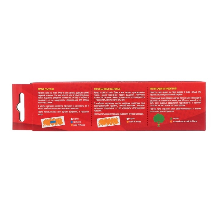 Против грызунов: На лист бумаги или картона нанести Клей Mr.Mouse ровным слоем шириной не менее 1 см для мышей и не менее 2,5 см для крыс. (Возможно просто выдавить требуемое количество состава из тюбика и размазать его по поверхности необходимым для отлова животных слоем). В центре ловушки поместить приманку и установить ее в местах наиболее вероятного появления животных. После использования лист бумаги выбросить в мусорное ведро.