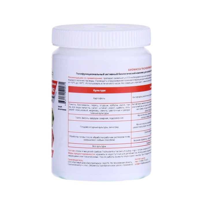 Полифункциональный активный биологический комплекс широкого спектра действия для содействия в профилактике комплекса болезнейрастений, вызванных фитопатогенными грибами и бактериями на основе спор и мицелия грибов Trichoderma harzianum и продуктов ихметаболизма (биологически активные вещества). Рекомендации по применению и подготовка бакового раствора:• Препарат применяется как профилактическое средство против болезней с/х культур или на начальных их стадиях.• Для обработки препарат растворяют в воде, не содержащей хлора. Температура рабочего раствора не должна быть ниже +10°С. При приготовлении рабочего(бакового раствора) рекомендуется предварительно подготовить маточный раствор.• При приготовлении многокомпонентных баковых смесей рекомендуется проводить пробное смешивание для проверки стабильности рабочего раствора.• При смешивании в рабочем растворе с химическими пестицидами (гербицидами, инсектицидами) и удобрениями препарат добавляется вбаковый раствор в последнюю очередь.• После приготовления рабочего раствора рекомендуется обеспечить его периодическое перемешивание, чтобы исключить образование осадка.• Приготовленный рабочий раствор необходимо использовать в течение 6-ти часов.• Оптимальный рН рабочего раствора в пределах 5,5 – 7,0. Использование жёсткой воды (особенно воды из скважин) может снижать эффективность действия препарата.• Опрыскивание посевов или насаждений растений целесообразно проводить утром или вечером в периоды минимальной солнечной активности, при сухойбезветренной погоде и низкой вероятности осадков в течение следующих 8-10 часов.• Обязательно применять такое количество рабочего раствора, которое обеспечит качественное и обильное смачивание поверхности растений.• Семена обрабатывать препаратом в тени или местах, защищённых от попадания прямых солнечных лучей.Не является пестицидом и агрохимикатом.Безопасен для людей, теплокровных животных, птиц, рыб, пчёл и окружающей среды