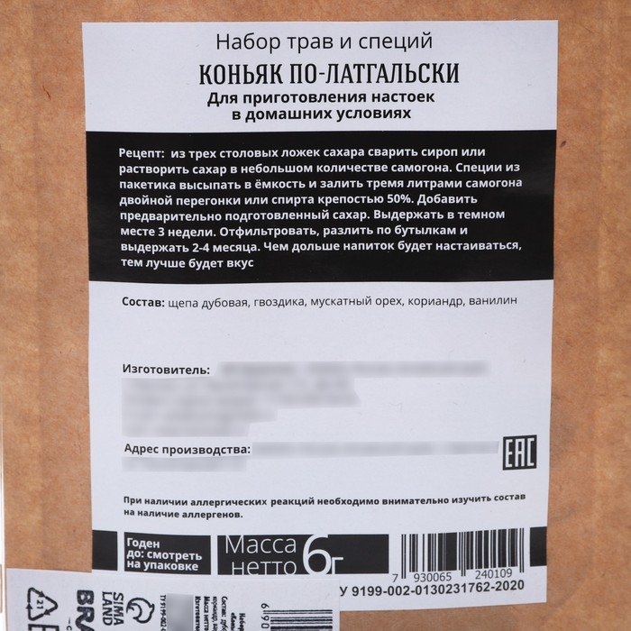 Набор трав и специй «Коньяк по-латгальски» для приготовления алкоголя, 6 г.