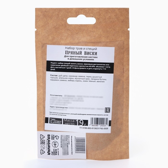 Набор трав и специй «Пряный виски» для приготовления алкоголя, 19 г.