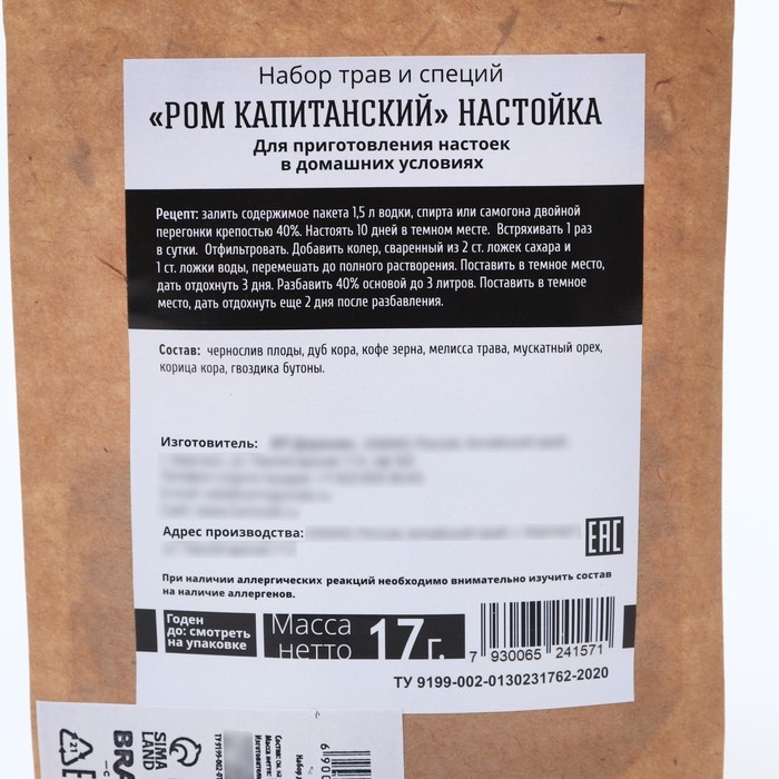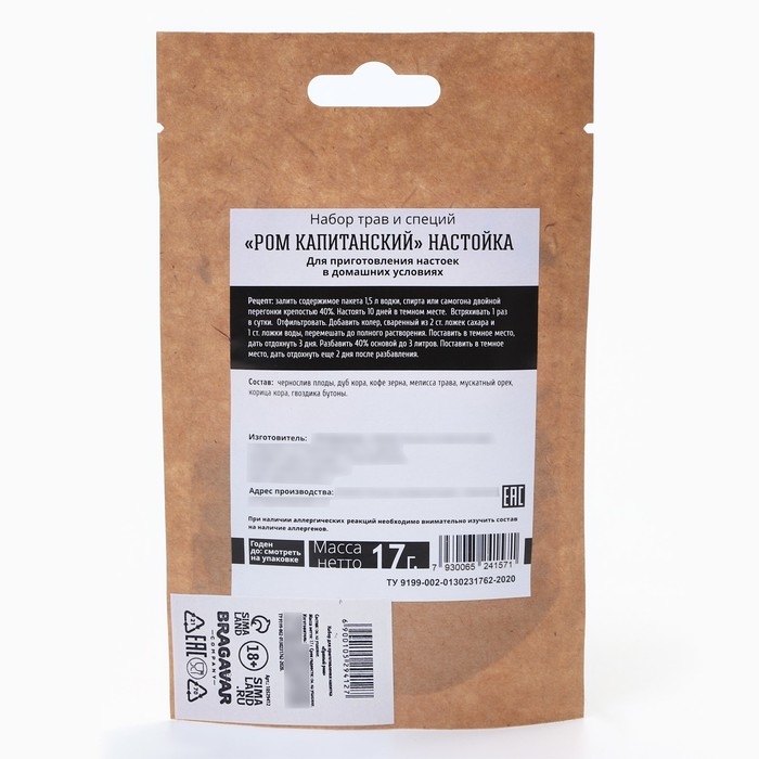 Набор трав и специй «Ром капитанский» для приготовления алкоголя, 17 г.