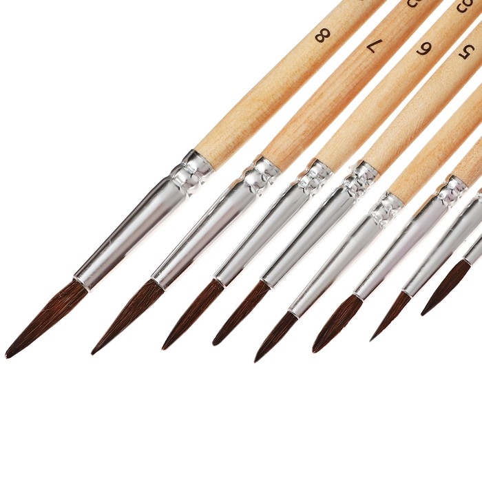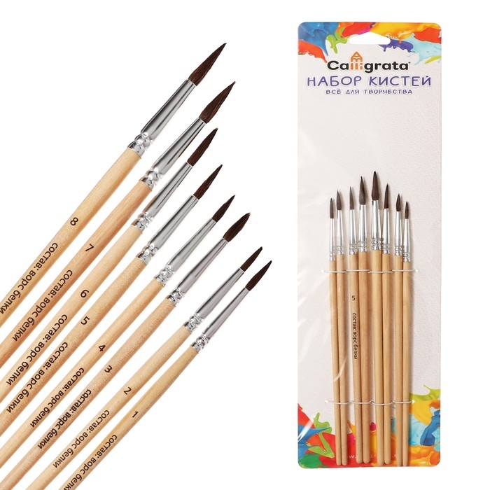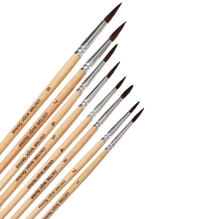 Набор кистей белка, круглые, 8 штук (№1,2,3,4,5,6,7,8) с деревянными ручками, на блистере