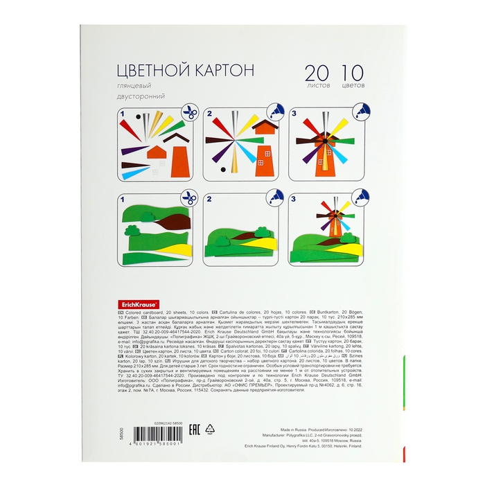 Картон цветной А4, 20 листов, 10 цветов, глянцевый в папке, ErichKrause, набор для детского творчества