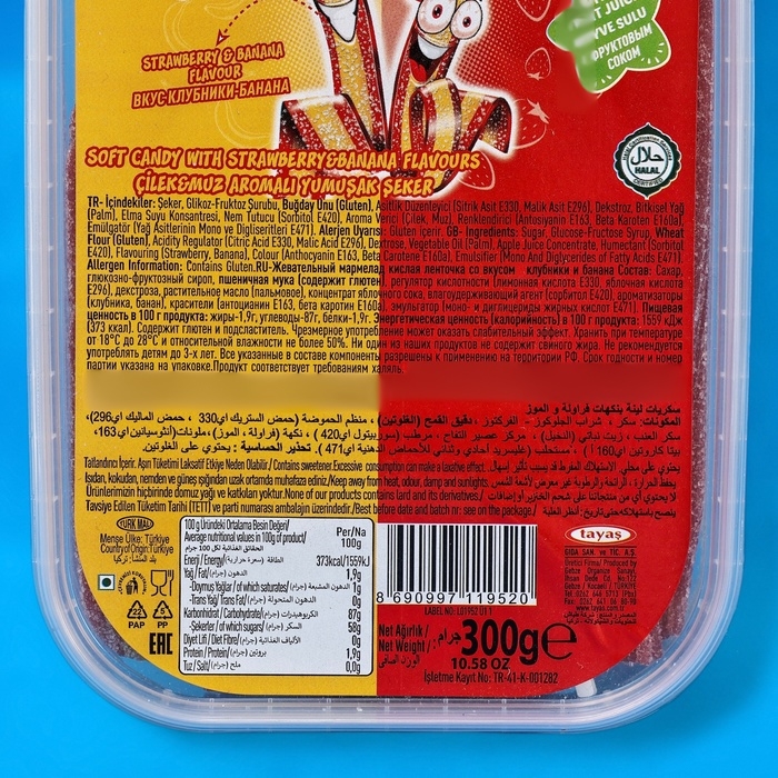Жевательный кислый мармелад - идеальный выбор для всех сладкоежек! Он идеально подойдет для детских праздников, подарков или просто как приятный лакомый перекус. Его можно использовать для игры, чтобы занять детей на время, и в то же время угостить их кислым мармеладом со вкусом банана и клубники.
