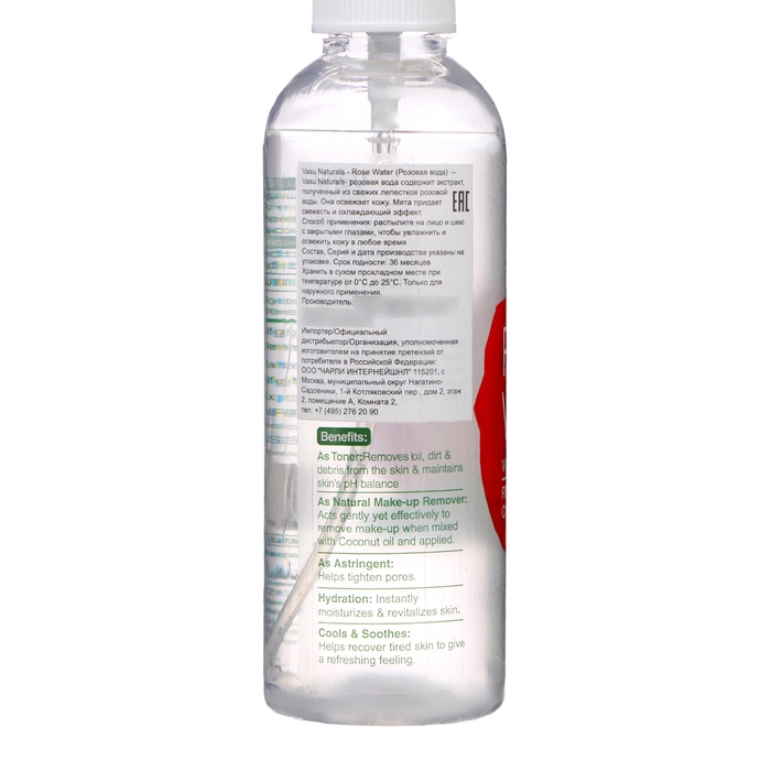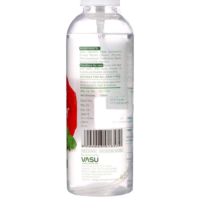 Розовая вода изготавливается из эфиромасличных сортов роз с использованием метода паровой дистилляции. Не содержит спирта и не сушит кожу. Этот ароматный препарат с натуральным экстрактом розы и мятой помогает надолго сохранить кожу красивой и молодой, увлажняет кожу, оказывает легкое антисептическое действие, устраняет микротрещины эпидермиса. Придание коже эластичности, устранение ощущения стянутости, избавление от раздражения, замедление процессов старения, стимуляция кровообращения.