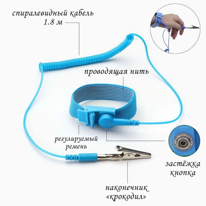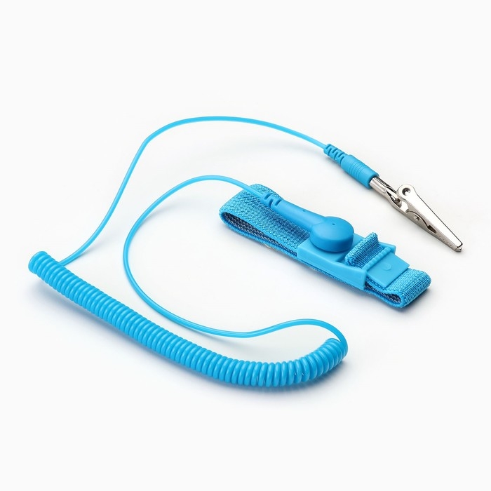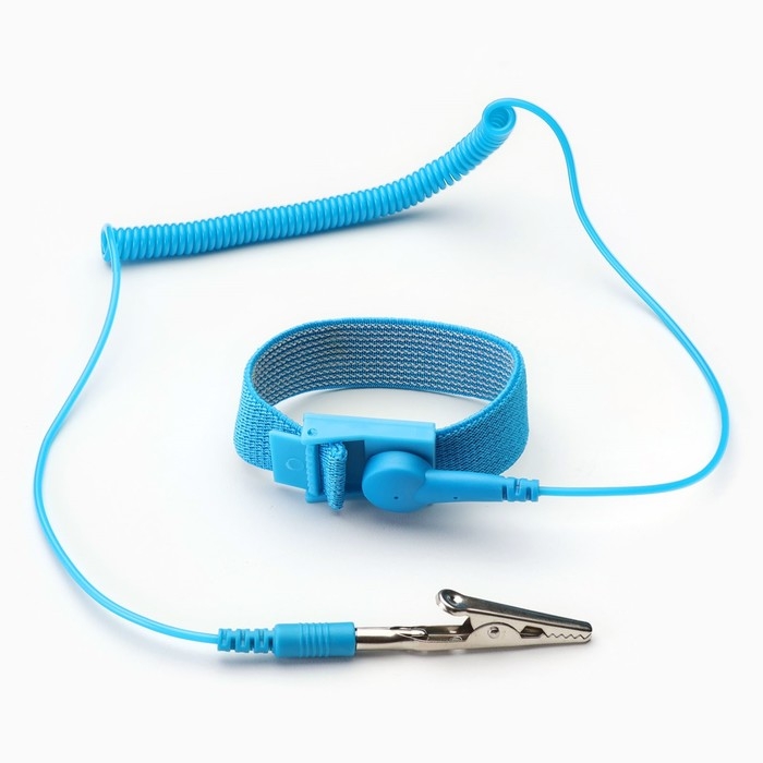 Антистатический браслет для работы с электрическими приборами с эластичной тесемкой и зажимом применяют при работе с электрическими приборами, платами и электронными компонентами для безопасности при пайке легкоплавкими припоями электронных элементов, проводников, во время работы с электрическими цепями. Браслет защищает от статического электричества и напряжения.