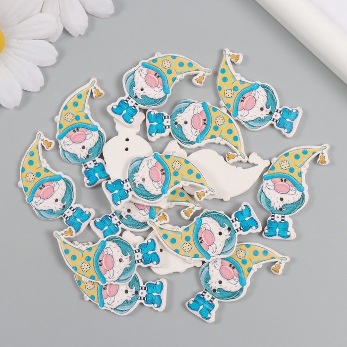 Пуговицы дерево для творчества 2 прокола "Гном в колпаке в горох" набор 15 шт 2х4 см
