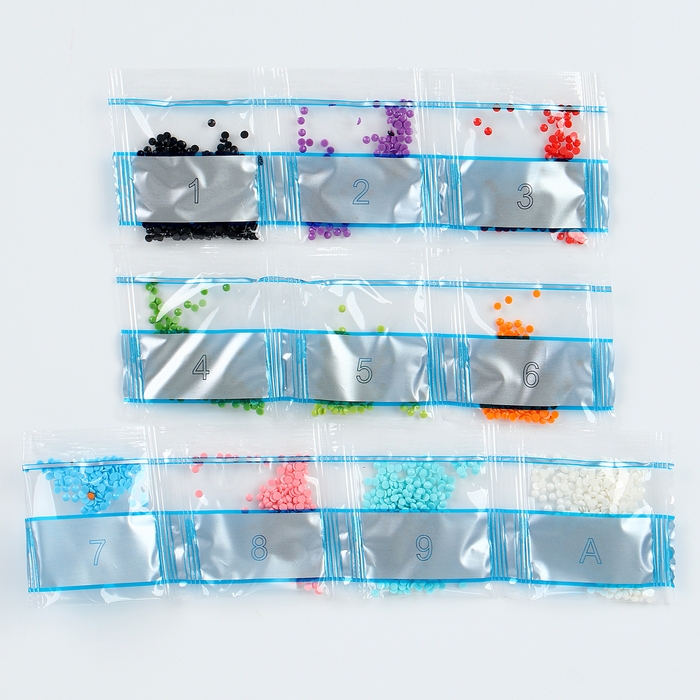 С помощью специального карандаша вам нужно разложить стразы по нарисованной схеме с обозначением необходимых цветов.