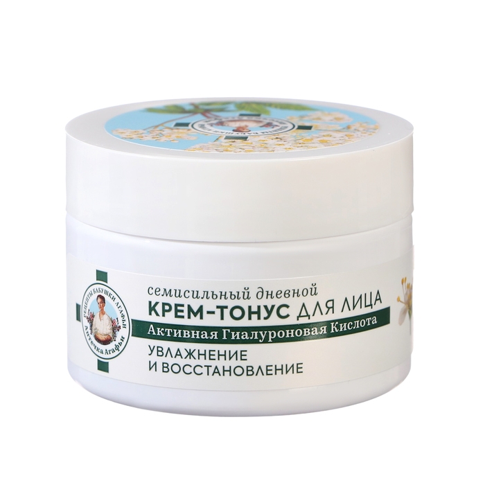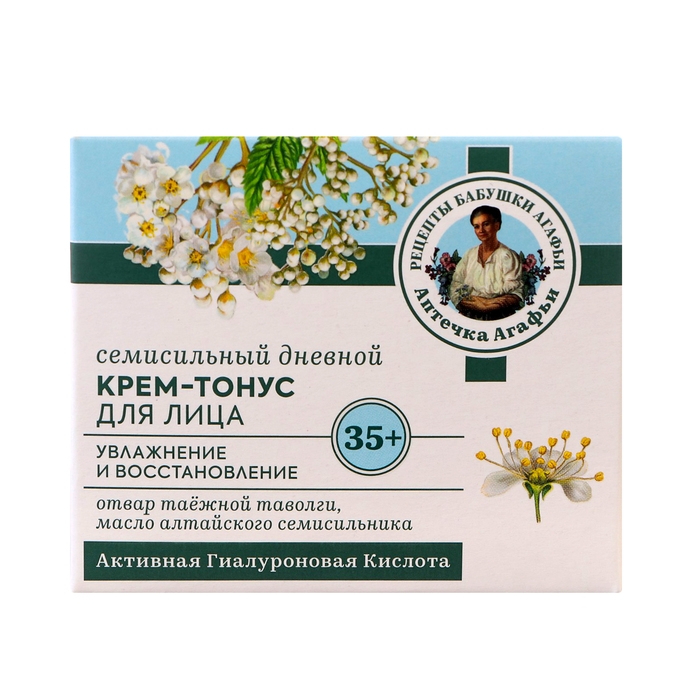 Объединив современные косметические разработки и традиционные рецепты сибирской травницы, мы создали для вас целебную серию Аптечка Агафьи. Семисильный дневной крем - тонус на берёзовом соке создан специально для предупреждения первых возрастных изменений кожи по старинным рецептам сибирской травницы Агафьи Тихоновны Ермаковой. Он обеспечивает непрерывное увлажнение на 12 часов, разглаживает мелкие морщинки, устраняет следы усталости и придаёт лицу отдохнувший, свежий вид. Лёгкая текстура крема дарит коже ощущение шелковистости, она выглядит более гладкой и сияющей. При регулярном использовании её состояние улучшается с каждым днём. Отвар таежной таволги: наполняет клетки кожи живительной влагой и придаёт лёгкое сияние, а также повышает защитные функции кожи. Масло алтайского семимильника: благодаря высокому содержанию флавоноидов и эфирных масел, оздоравливает кожу на клеточном уровне, глубоко питает и насыщает витаминами молодости. Экстракты таежного шиповника и столетника: способствуют синтезу коллагена и эластина в клетках, повышают тонус и упругость кожи. Активная гиалуроновая кислота: восполняет запас влаги, разглаживает мелкие морщинки и придаёт естественное сияние.