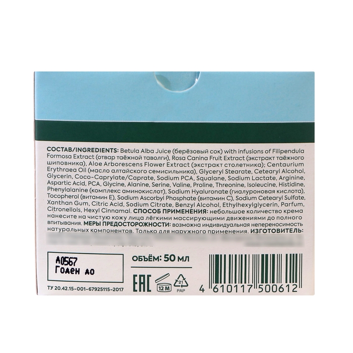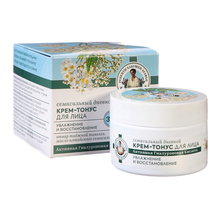 Состав: Объединив современные косметические разработки и традиционные рецепты сибирской травницы, мы создали для вас целебную серию Аптечка Агафьи. Семисильный дневной крем - тонус на берёзовом соке создан специально для предупреждения первых возрастных изменений кожи по старинным рецептам сибирской травницы Агафьи Тихоновны Ермаковой. Он обеспечивает непрерывное увлажнение на 12 часов, разглаживает мелкие морщинки, устраняет следы усталости и придаёт лицу отдохнувший, свежий вид. Лёгкая текстура крема дарит коже ощущение шелковистости, она выглядит более гладкой и сияющей. При регулярном использовании её состояние улучшается с каждым днём. Отвар таежной таволги: наполняет клетки кожи живительной влагой и придаёт лёгкое сияние, а также повышает защитные функции кожи. Масло алтайского семимильника: благодаря высокому содержанию флавоноидов и эфирных масел, оздоравливает кожу на клеточном уровне, глубоко питает и насыщает витаминами молодости. Экстракты таежного шиповника и столетника: способствуют синтезу коллагена и эластина в клетках, повышают тонус и упругость кожи. Активная гиалуроновая кислота: восполняет запас влаги, разглаживает мелкие морщинки и придаёт естественное сияние.
