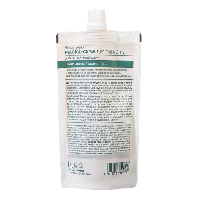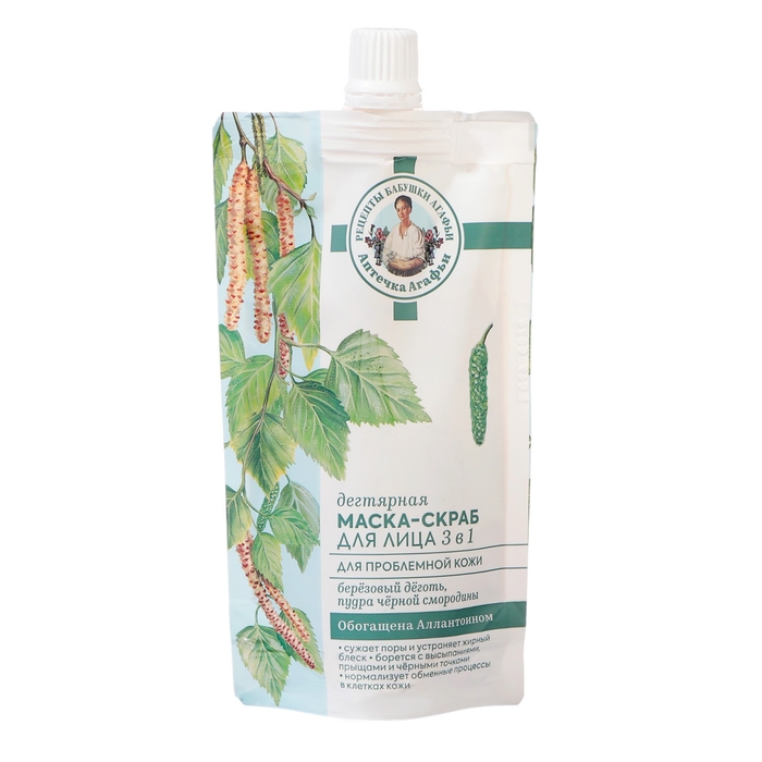 Дегтярная маска-скраб для лица 3 в 1. Объединив современные косметические разработки и традиционные рецепты сибирской травницы, мы создали для вас целебную серию Аптечка Агафьи. Дегтярная маска-скраб для лица на серебряной воде создана по старинным рецептам сибирской травницы Агафьи Тихоновны Ермаковой. Она глубоко очищает, бережно отшелушивает и успокаивает кожу. Регулярное применение маски 3 в 1 может заменить даже салонный уход. Берёзовый дёготь эффективно снижает выработку себума и результативно борется с бактериями, отбеливает кожу, спасает от акне, угрей и покраснений. Пудар чёрной смородины помогает проблемной коже справиться с воспалениями, возвращает сияние и здоровый вид. Масло горного шалфея обладает тонизирующим и антисептическим действием. Предупреждает появление воспалений на коже. Аллантоин известен своими заживляющими свойствами, успокаивает, стимулирует обновление клеток, мягко отшелушивает и защищает от неблагоприятного воздействия окружающей среды.