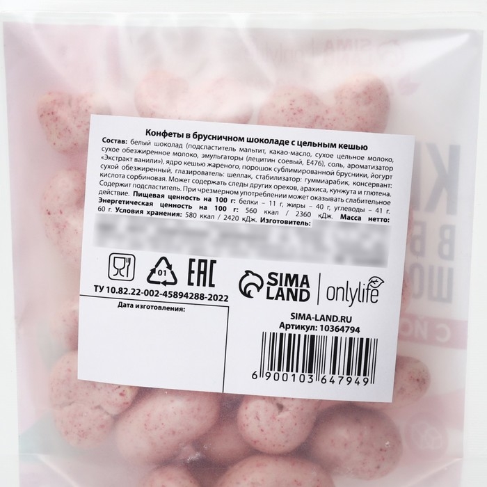 Состав: белый шоколад (подсластитель мальгит, какао-масло, сухое цельное молоко, сухое обезжиренное молоко, эмульгаторы (лецитин соевый, Е476), соль, ароматизатор "Экстракт ванили"), ядро кешью жареного, порошок сублимированной брусники, йогурт сухой обезжиренный, глазирователь: шеллак, стабилизатор: гуммиарабик: консервант: кислота сорбиновая.
