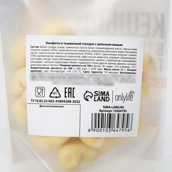 Состав: белая глазурь (сахар, заменитель масла какао (пальмоядровое масло, эмульгаторы ( лецитин соевый, Е492)), сухая молочная сыворотка, заменитель молочного жира (пальмовое масло, подсолнечное масло, антиокислители (Е304(i), Е307)), эмульгаторы (лецитин соевый, Е476), ароматизатор: ванильно-сливочный), ядро кешью жареного, порошок сублимированной тыквы, йогурт сухой обезжиренный, глазирователь: шеллак, стабилизатор: гуммиарабик, консервант: кислота сорбиновая.