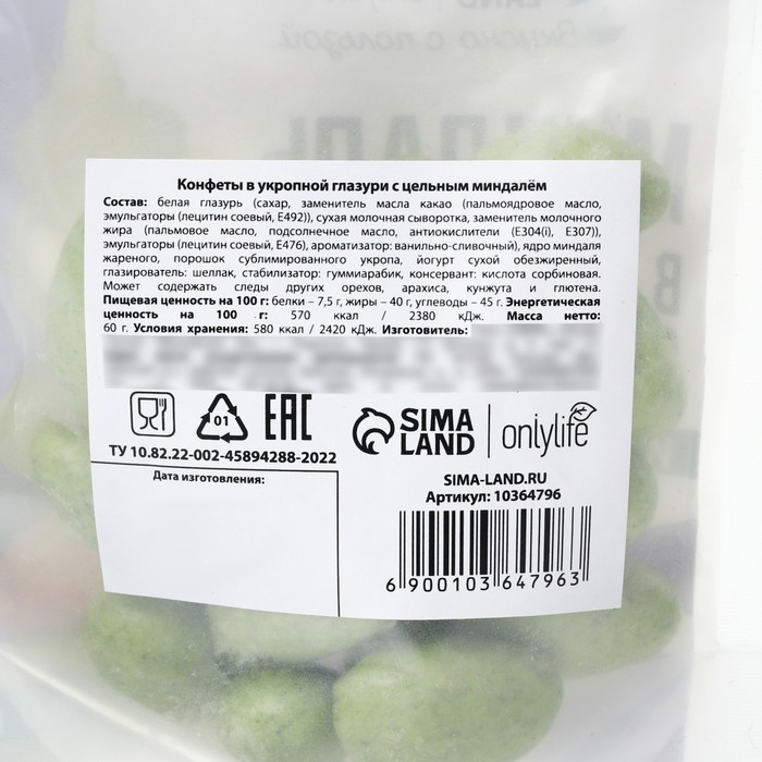 Состав: белая глазурь (сахар, заменитель масла какао (пальмоядровое масло, эмульгаторы ( лецитин соевый, Е492)), сухая молочная сыворотка, заменитель молочного жира (пальмовое масло, подсолнечное масло, антиокислители (Е304(i), Е307)), эмульгаторы (лецитин соевый, Е476), ароматизатор: ванильно-сливочный), ядро миндаля жареного, порошок сублимированной укропа, йогурт сухой обезжиренный, глазирователь: шеллак, стабилизатор: гуммиарабик, консервант: кислота сорбиновая.