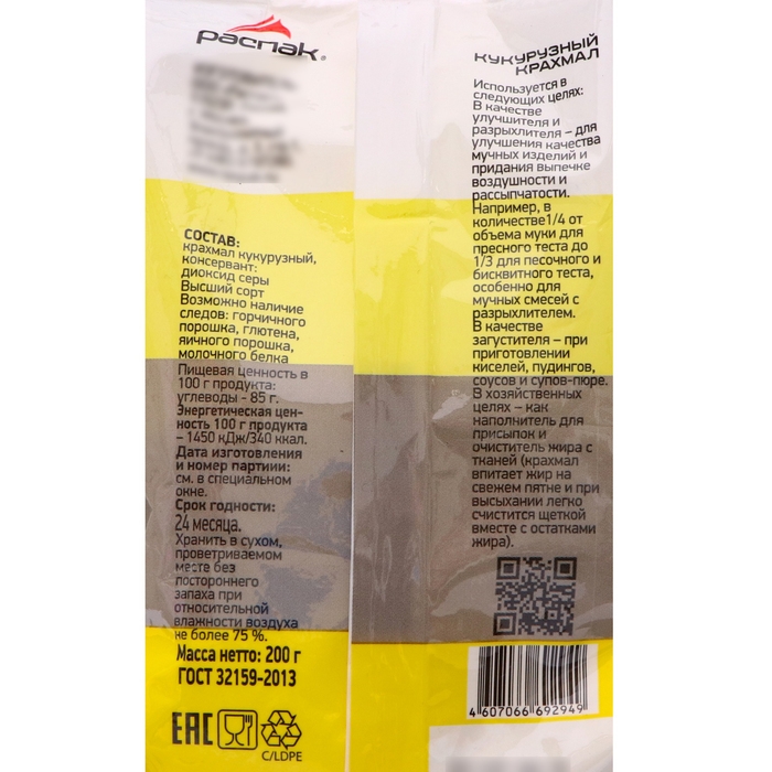 Кукурузный крахмал - это натуральный загуститель для соусов, начинки и других блюд. Он также широко используется во многих рецептах тортов и печенья или в качестве ингредиента в безглютеновой выпечке. Кукурузный крахмал часто добавляют в рецепты песочного печенья, где он придает готовому продукту рассыпчатую и нежную текстуру. Также он подходит для приготовления выпечки кексов, печенья, пряников, тортов и вафель.