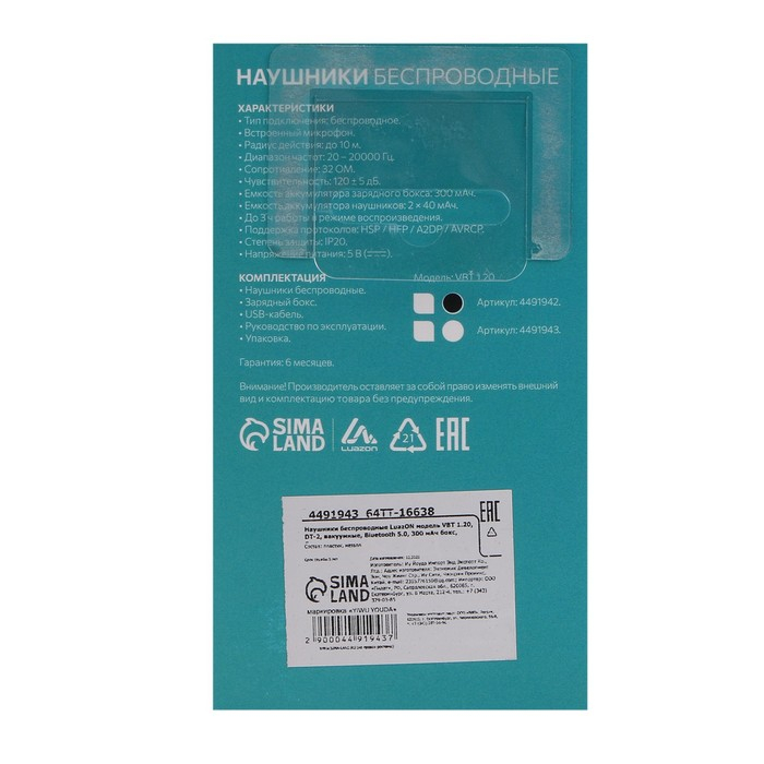 Наушники беспроводные Luazon VBT 1.20, вакуумные, Bluetooth 5.0, 300 мАч бокс, белые