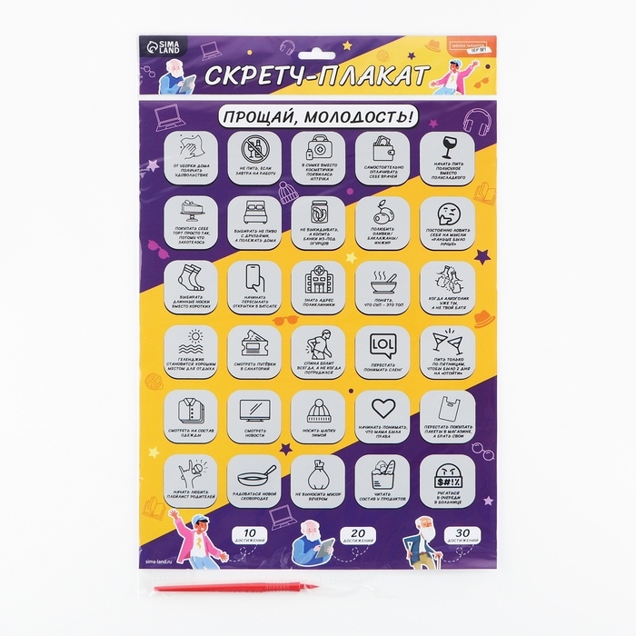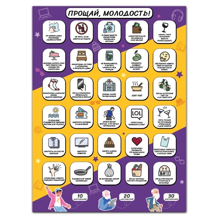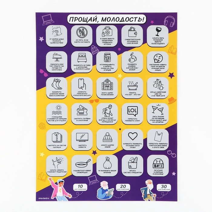 Этот плакат предлагает вам и вашим друзьям шанс проверить себя по забавному чек-листу из 30 пунктов, которые заставят вас задуматься и посмеяться над изменениями, которые происходят с возрастом.