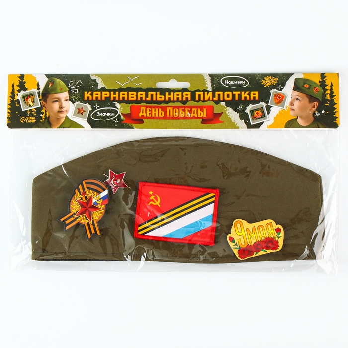 - Пилотку можно украсить красочными значками и нашивкой с тематической символикой. Дизайн декоративных элементов продуман до мелочей и создаёт праздничное настроение.