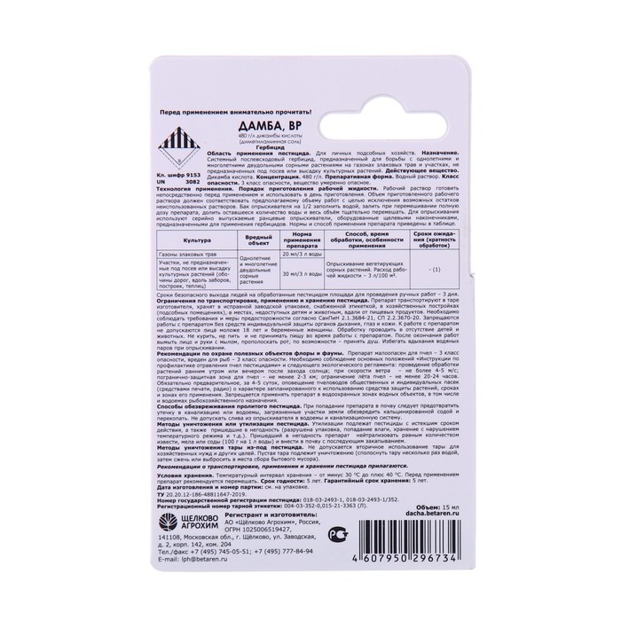 Гербицид сплошного действия для уничтожения сорняков Дамба, ВР, 15 мл