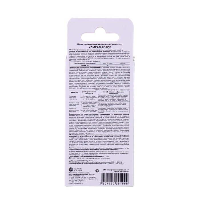Жидкое боросодержащее микроудобрение Ультрамаг бор, для листовых подкормок основных культур,100 мл