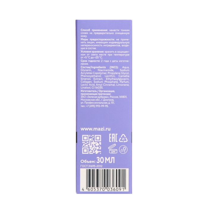 Состав: Aqua, Glycerin, Niacinamide, Sodium Acrylates Copolymer, Propylene Glycol, Phenoxyethanol, Lecithin, Camellia Sinensis Extract, Ethylhexylglycerin, Collagen, Sodium Phosphate, Parfum, Lactic Acid, Amyl Cinnamal, Limonene, Linalool, CI 16035.