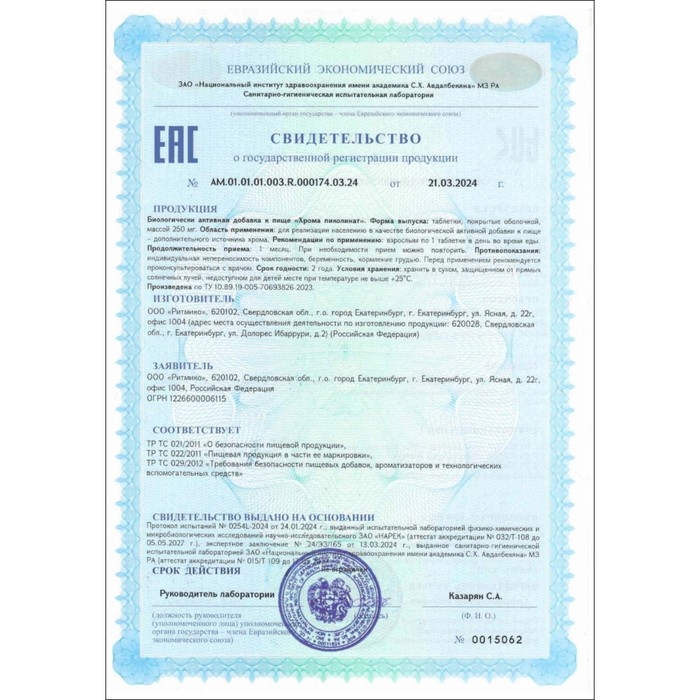 Хрома пиколинат - легкоусвояемая форма хрома, принимает участие в регуляции углеводного и жирового обмена.