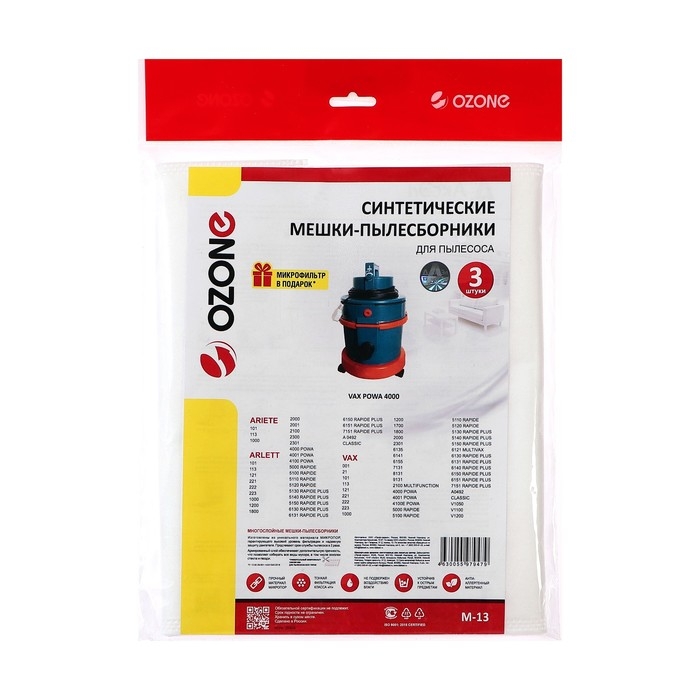 Мешок-пылесборник M-13 Ozone синтетические для пылесоса, 3 шт + микрофильтр