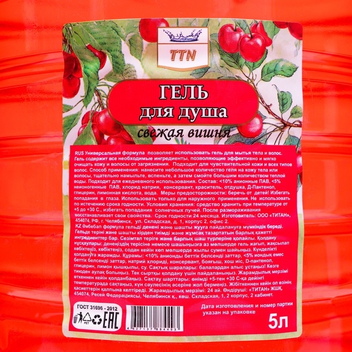 Объем в 5 литров делает гель для душа TITAN "Свежая вишня" невероятно экономичным в использовании. Большого объема хватит на долгое время, что делает его идеальным выбором для всей семьи. Наслаждайтесь свежестью и ароматом каждый раз, когда принимаете душ!