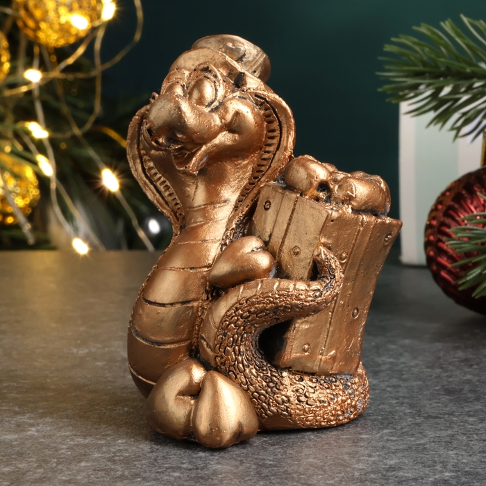 Новый год. Символ 2025. Фигура "Змея с подарком" состаренная бронза, 6х4х4см