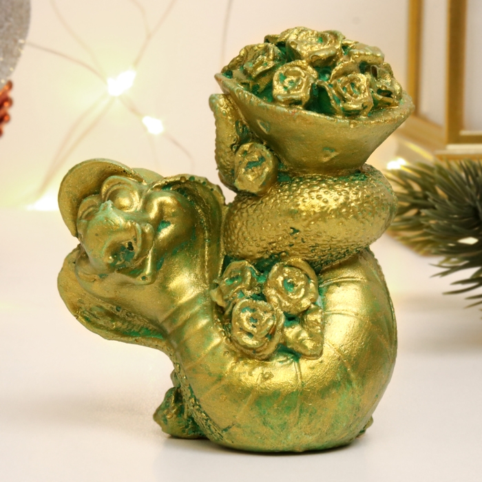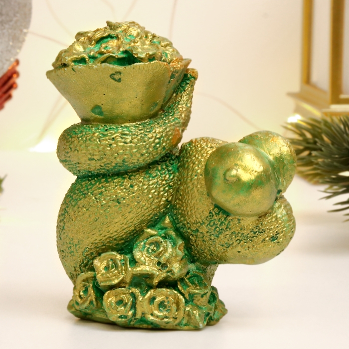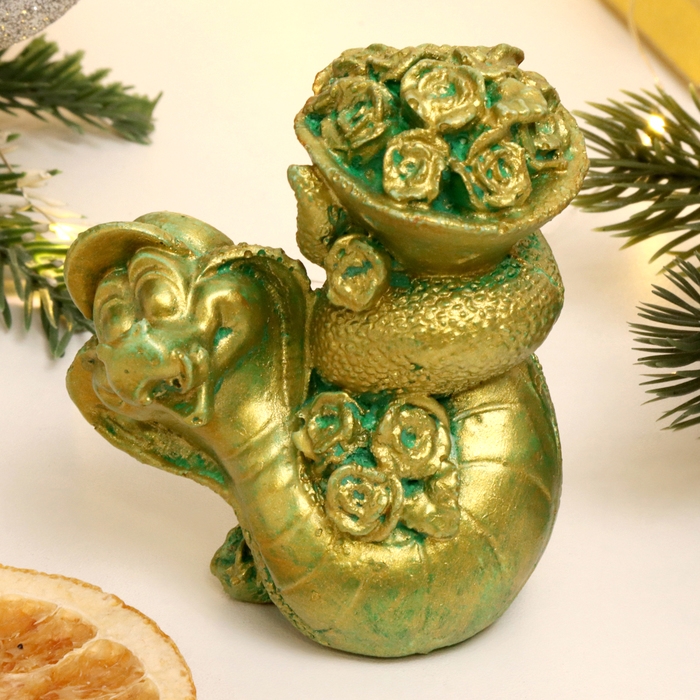 Новый год. Символ 2025. Фигура "Змея с цветами" зеленый с позолотой, 7х7х5см