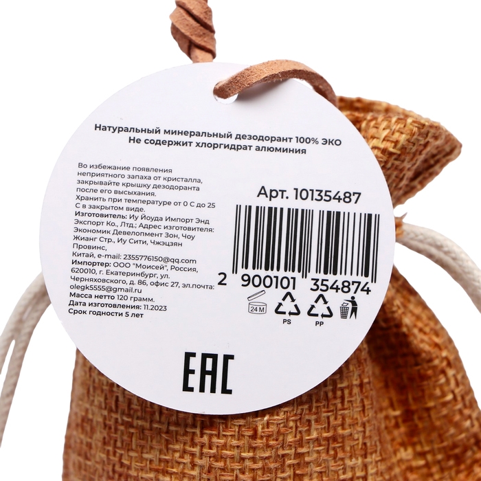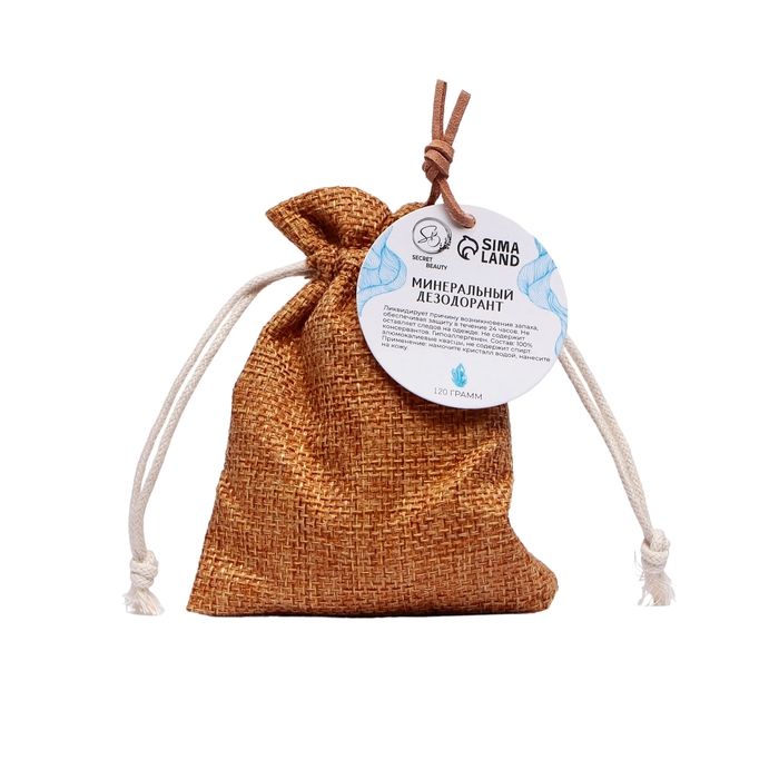 Минеральный дезодорант. Представляет собой натуральный кристалл алунит, обладающий высокой антибактериальной активностью. Предотвращает появление пота и неприятного запаха в течение всего дня. Заживляет ранки и увлажняет. Дезодорант упакован в мешочек и имеет подвес для удобства носки, как на руке, в руках, так и на чем-то из вещей, вместе с вещами и т.д.