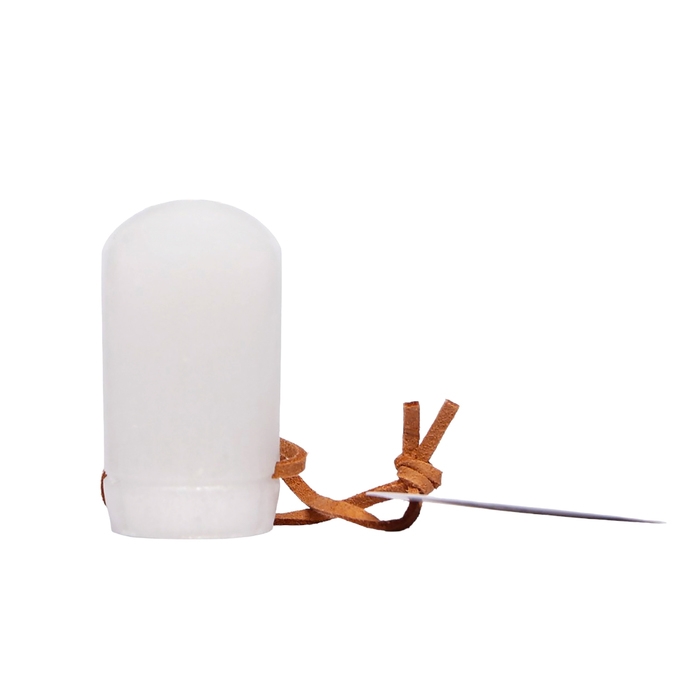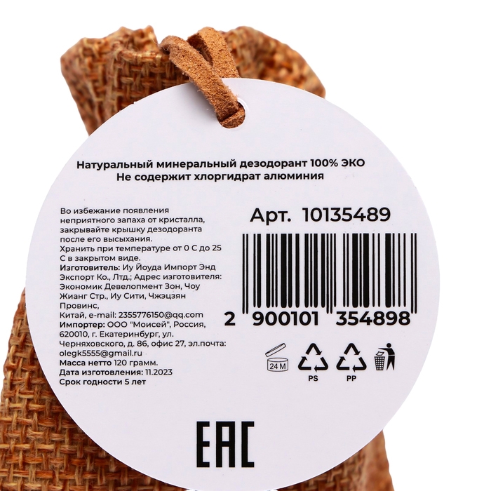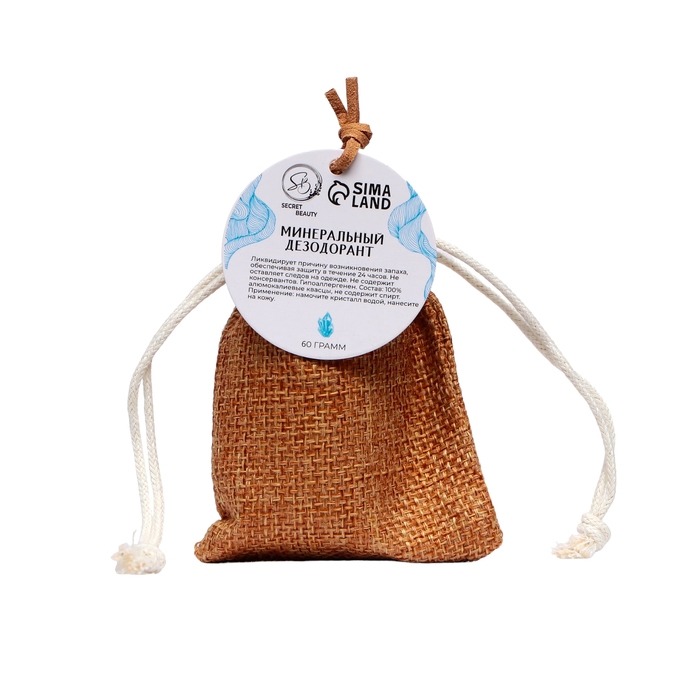Минеральный дезодорант. Представляет собой натуральный кристалл алунит, обладающий высокой антибактериальной активностью. Предотвращает появление пота и неприятного запаха в течение всего дня. Заживляет ранки и увлажняет. Дезодорант упакован в мешочек и имеет подвес для удобства носки, как на руке, в руках, так и на чем-то из вещей, вместе с вещами и т.д.