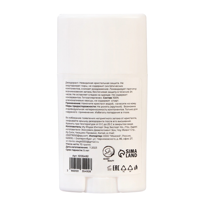 Минеральный дезодорант в стике. Представляет собой натуральный кристалл алунит, обладающий высокой антибактериальной активностью. Предотвращает появление пота и неприятного запаха в течение всего дня. Заживляет ранки и увлажняет. Форма стика приятна именно тем, что можно использовать именно столько поверхности кристала, сколько нужно. Стик имеет механизм поднятия и опуска кристалла.